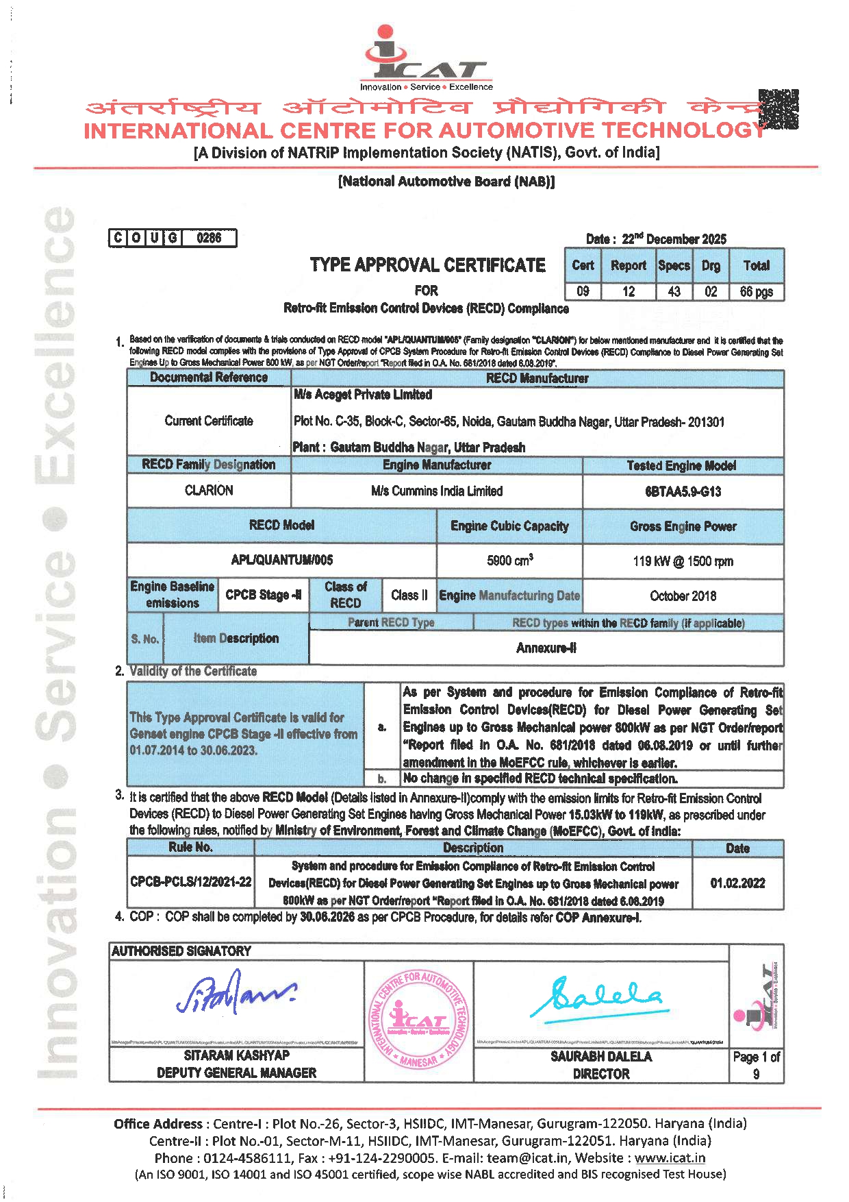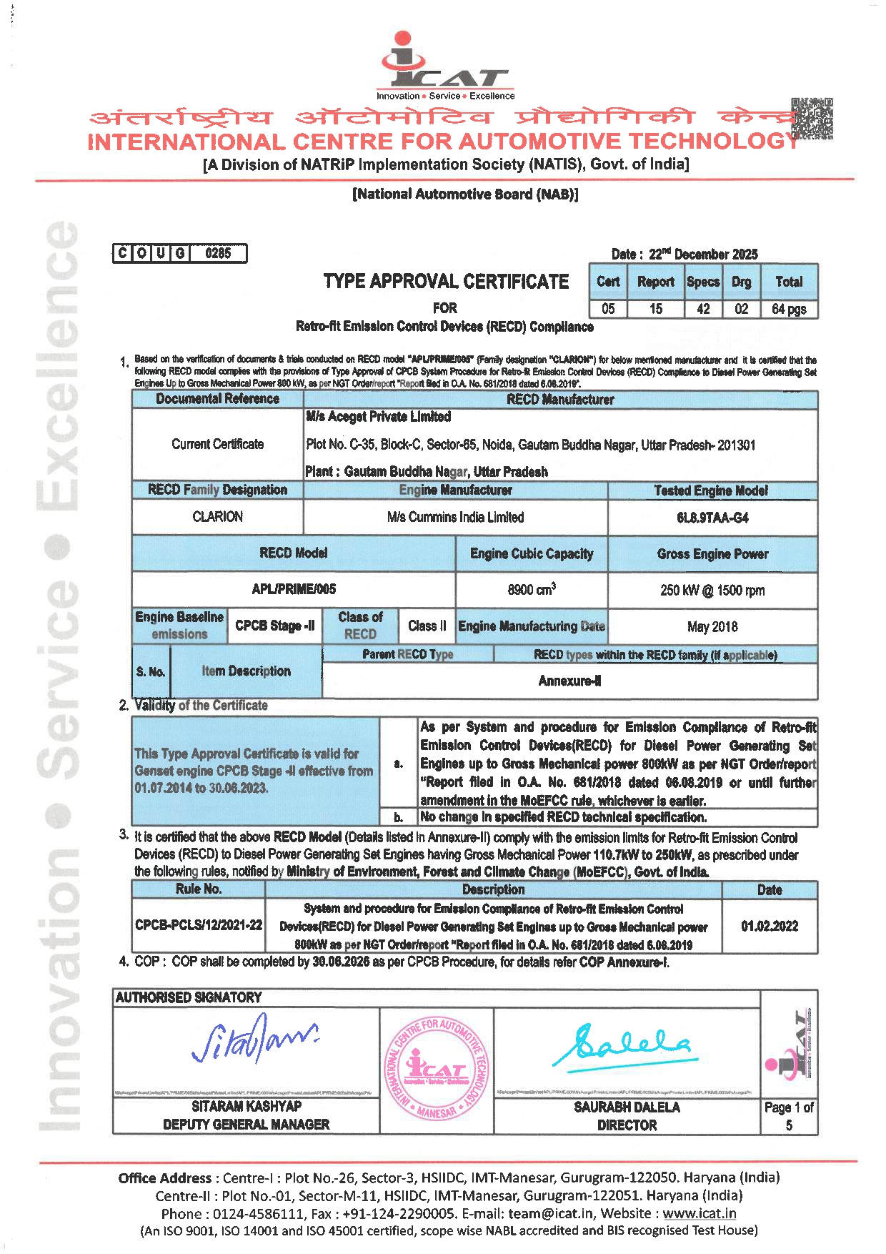 Compliance & Certifications Certificates ISO Certificate MSME Certificate GST Certificate CPCB Certificate IEC Certificate Type Approvals Type Approval 15.03kw to 119kw Type Approval 110.7kw to 250kw